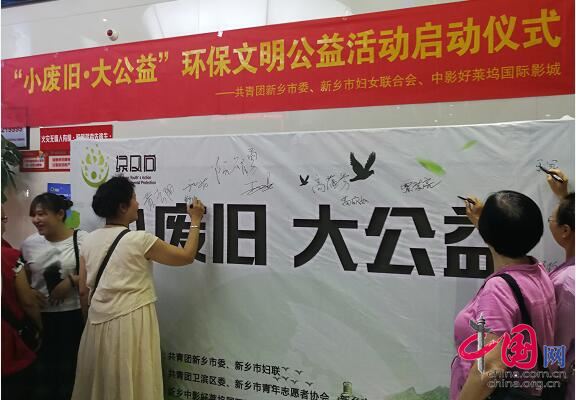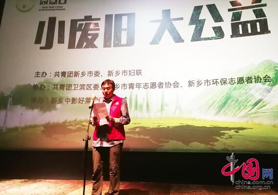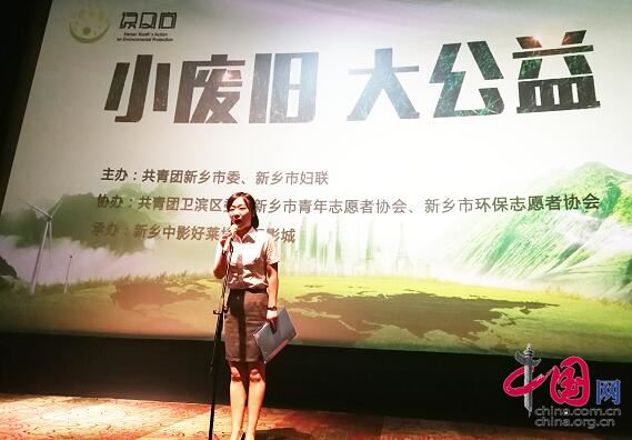 中國網6月5日訊 6月5日是世界環(huán)境日,6月5日上午9時30分許,由共青團新鄉(xiāng)市委、新鄉(xiāng)市婦女聯合會主辦的新鄉(xiāng)市“小廢舊 大公益”文明環(huán)保我先行公益活動在新鄉(xiāng)市衛(wèi)濱區(qū)中影好萊塢國際影城5樓3號廳舉行。新鄉(xiāng)市青年志愿者協(xié)會代表、新鄉(xiāng)市環(huán)保志愿者協(xié)會代表、環(huán)衛(wèi)工代表、婦女代表、志愿者團隊代表、大學生代表等300余人參加了活動。