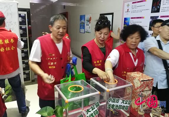 志愿者把廢舊電池放入“小廢舊 大公益”回收箱