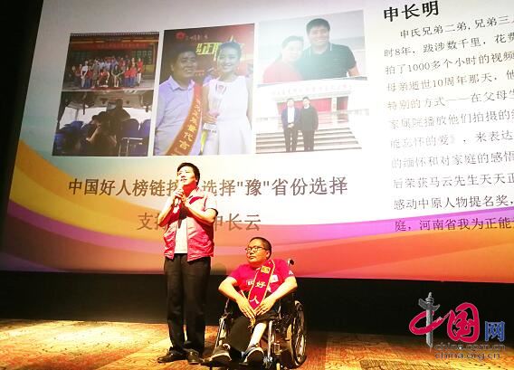 趁著活動的東風,中國好人毛山林和6月份中國好人榜候選人申氏兄弟申長明上臺講述了申氏兄弟三人歷時8年為自己的父母拍攝微電影《不能忘懷的愛》的孝老愛親故事,讓更多的人了解申氏兄弟,為投票助力。